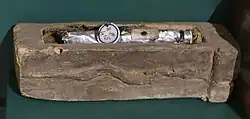 The exact start of the use of mummy brown is unclear. A 1594 document mentions it but it credits a document dating back to the 12th century.[8] The pigment was made from the flesh of Egyptian mummies or Guanche mummies of Canary Islands (both human and feline),[9][10] mixed with white pitch and myrrh.[4][5] The earliest record of the use of mummy brown dates back to 1712 when an artist supply shop called "À la momie" in Paris sold paints, varnish, and powdered mummy.[2] In 1797, a Compendium of Colours published in London proclaimed that the finest brown used as a glaze by Benjamin West, the president of the Royal Academy, "is the flesh of mummy, the most fleshy are the best parts."[7]