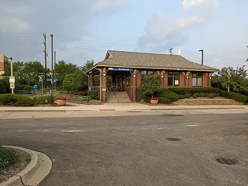 Mundelein is a station on Metra's North Central Service in Mundelein, Illinois. The station is 39.6 miles (63.7 km) away from Chicago Union Station, the southern terminus of the line.[3] In Metra's zone-based fare system, Mundelein is in zone 4. As of 2018, Mundelein is the 148th busiest of Metra's 236 non-downtown stations, with an average of 276 weekday boardings.[2] Service began on August 19, 1996, but the building was not completed until 1997. The parking lot was expanded later. As with other North Central stations, there is no ticket agent and no weekend service to this station. In addition to train service, it is used for parking for Carmel High School "Street Scenes," and for occasional electronic waste disposal events.