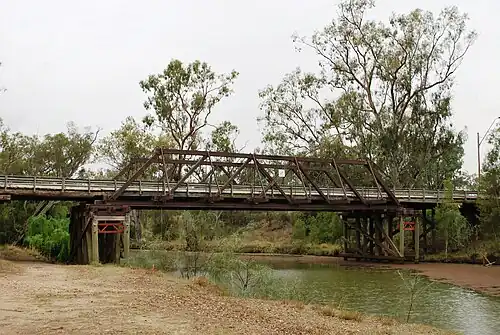 The original Mungindi Bridge was a Dare-type truss road bridge, designed by Harvey Dare. It was one of forty Dare-type truss bridges built in New South Wales. The bridge was built by Lawson and Wladro in 1914. It was a single timber truss span of 27.7 metres (91 ft), with two timber approach spans at each end giving the bridge an overall length of 61.6 metres (202 ft).[3]