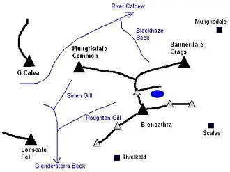 The Glenderaterra Beck lies to the west of Mungrisdale Common and its tributary, Roughten Gill, forms the southern boundary. A further feeder on this flank is Sinen Gill, whose waterfall is one of the fell's most notable features.[1] The River Caldew lies to the north, across which is Great Calva, most southerly of the Back o'Skiddaw fells. Despite its uninspiring appearance Mungrisdale Common does therefore stand on the important Eden-Derwent watershed, though it is not well defined at this point. Water from the southern flanks reach the sea at Workington while rain falling on the northern side heads for the Solway Firth via Carlisle. The watershed continues across Skiddaw Forest between the headwaters of the Caldew and Glenderaterra, linking onward to Lonscale Fell in the Skiddaw range.