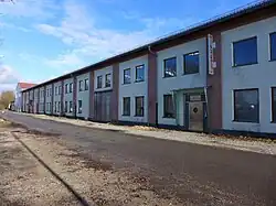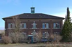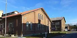 There was another transfer table to the south of the southern switch construction workshop and Hall 3. The building of the former training workshop stands to the south of the transfer table. It consists of a three-storey main building with a hipped roof, to which long, single-storey extensions are attached to the west, south and east. Nine of the former factory buildings and the access gate have been listed buildings since 2008. In addition to the listed buildings, the former training workshop still exists; the other buildings were demolished by 2013.[34]