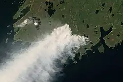 A major wildfire started around May 27, 2023, near Barrington Lake.[24] The fire has burned around 23,015 hectares (56,871 acres) or 230.15 km2 as of 2 June 2023.[25][26] The response to the fire included widespread evacuation orders of the surrounding area, displacing around 5000 people.[27] All schools in Shelburne County were closed in response to the fires.[28] The wildfire is the largest recorded in the history of Nova Scotia.[29][30]