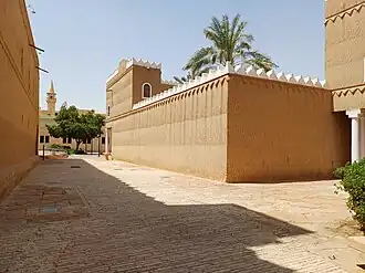 The palace was built by King Abdulaziz outside the walled town of Riyadh, being the first major expansion of the city in the twentieth century.[2] Construction was started in 1936 and partly finalized in 1938.[3] It was fully completed in 1945.[4] The construction was supervised by builder Ibn Qabba, but the King also personally involved in the construction process.[5] The palace was intended to be a family residence and court for the king.[6] With the construction of the palace three novel technologies were introduced to the Saudi society: the use of the automobiles as means of transportation, electricity by means of generators and water closets with drainage systems.[2] In order to connect the palace with the city center a concrete road was constructed which was also new in the city.[7] In 1939 electricity, lighting, fans, limited air-conditioning, a central water supply and lavatories were added by the Aramco technicians to the palace.[5]