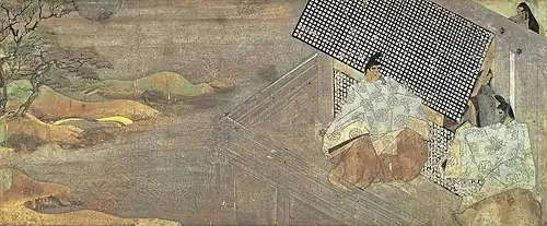 In the top right corner, Murasaki's friend, the maid Saishō no Kimi, is visible.[52] The large garden occupying the left half of the painting and the diagonally positioned building are considered to be a bold scene arrangement.[53] According to Penelope Mason, this is "one of the saddest and most beautiful [scenes] in the scroll", contrasting the beauty of the moonlit garden and pond on the left with the constraints of court life.[52] The latticed shitomi and the stewards separate Murasaki Shikibu from the outside world, keeping her a prisoner in the room.[51][52]