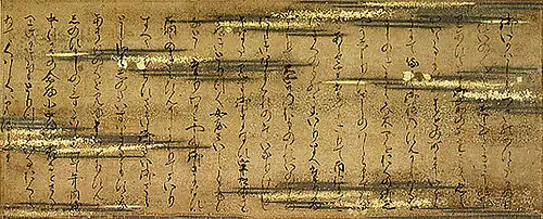 An emaki of Murasaki Shikibu's diary is mentioned in the Meigetsuki ("Record of the clean moon"), the diary of the poet and scholar Fujiwara no Teika. According to this document, in 1233 several aristocrats close to cloistered Emperor Go-Horikawa planned to create a new emaki of The Tale of Genji (after the 12th century Genji Monogatari Emaki, the best known of these works), accompanied by another of Murasaki's diary. However, there is no conclusive evidence that the extant scrolls correspond to those mentioned by Fujiwara no Teika, even though the consistency of manufacturing dates suggests that this is the case.[4] The paintings of the emaki have been attributed to the painter Fujiwara Nobuzane and the captions to the excellent calligrapher Gokyōgoku (後京極良経; 1169–1206), despite definitive evidence.[3][14]
