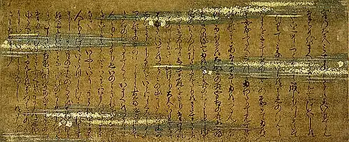 The 5th segment of the five-segment Matsudaira clan scroll was separated in 1932 and mounted as hanging scroll.[28] This fragment is 73.7 cm (29.0 in) wide.[63] Named after their present owners, it is known as the Morikawa clan edition. It consists of a single scene with a very short illustration showing the inside of a traditional Japanese style room with fusuma sliding doors, tatami and a curtain.[62] Like all but the first segment of this scroll, the scene is set in the evening of Kankō 5, 11th month, 1st day (December 1, 1008) on occasion of the 50th day celebration of the birth of Atsuhira-shinnō, the later Emperor Go-Ichijō.[62] Murasaki Shikibu and Saishō no Kimi had been hiding from the drunken carousal of that evening, but were discovered by Michinaga, Saishō no Chūjō and others. The painting is dominated by the massive figure of Fujiwara no Michinaga dressed in brocade jacket and trousers and placed in the centre of the room.[62] Murasaki Shikibu and Saishō no Kimi are huddled near the border of the painting with heads bent down as a sign of submission and deference.[51] On discovering the two court ladies in hiding, Michinaga demands a poem from each of them. Murasaki being frightened and helpless in this situation recites the following waka:[62][64]