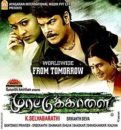 Murattu Kaalai (transl. Raging Bull) is a 2012 Tamil-language action film written and directed by K. Selva Bharathy and produced by Amirtham Gunanidhi. A remake of the 1980 film of same name, it stars Sundar C, Sneha and Sindhu Tolani, while Suman and Vivek play supporting roles. The music was composed by Srikanth Deva. The film, which had been under production since 2008, released on 15 June 2012 to negative reviews and failed to repeat the success of the original.[2]