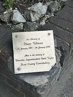- Memorial Plaque: A memorial plaque was installed near the site of Claire's murder on London Road, Greenhithe. However, in July 2003, the plaque was vandalized and removed from its stone base.[71]