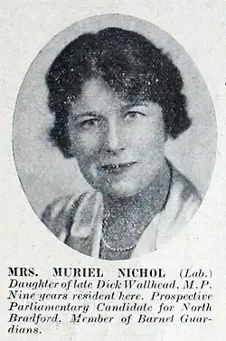 Muriel Edith Nichol JP (2 February 1893 Wilmslow, Cheshire – 28 May 1983 Welwyn Garden City, Hertfordshire), née Wallhead, was a Labour Party politician in England.