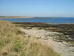 Murkle Bay Looking across Murkle Bay to the headland known as the Spur of Murkle. Viewed from the shore at East Murkle where the flagstone beds are fringed by a narrow beach of shell sand.