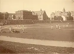From at least 1875 through the first few games of 1895, the team staged its home games at Penn's multi-purpose athletic grounds, aka University Grounds.[8][9] The field was on the block southeast of the 37th and Spruce intersection, a few blocks west of the eventual site of Franklin Field.[10] That site is now occupied by dormitories and a quadrangle. When a fire destroyed the Philadelphia Phillies' home ballpark in August of 1894, the Phillies played some home games here.[11]