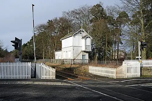 ![]() Level crossing and disused signal box at the site of the former station | |||||