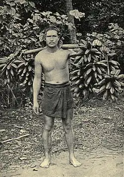 Fe'i bananas are an important component of ceremonial feasts in the Marquesas and the Society Islands.[3] Karat bananas are reported to be one of the few kinds of banana that can be used in ceremonial presentations in Pohnpei, Micronesia.[12] A Samoan legend is that the mountain banana and the lowland banana fought. The mountain banana – the Fe'i banana – won. Filled with pride at its victory, the mountain banana raised its head high, whereas the defeated lowland banana never raised its head again.[3] (Fe'i bananas have an upright fruiting stem, whereas the fruiting stem droops in other kinds of banana.)