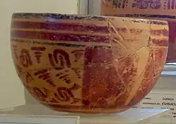 This item (catalogue number PSPA-625) is a ceramic vase excavated from the ruins of Curucuitz.[11] It was found buried in the North Structure of Group 24, where it was associated with a burial.[11] the vase has been dated to the Late Classic and is of the Paixban variety of the Paixban Ante Polychrome ceramic type, belonging to the Zacatal-Joyac ceramic group.[11]