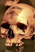The room shows a reconstruction (1988) of the Theatrum Anatomicum (anatomical theatre) (built 1596). A richly decorated instrument chest (1670) which belonged to the Leiden surgeon's guild. A small collection of objects (largely Egyptian antiquities) that survived from the now gone Leiden Theatrum (one of the oldest museums of Europe ) are shown as well. On the wall three paintings: one depicting the magistrates of the Catharina and Caecilia Hospitals (the latter now houses the museum), a second showing a Prussian peasant from whom a 10-inch sword, swallowed in a drinking bout, has surgically been removed, a third showing renowned surgeon and designer of medical instruments Cornelis Solingen (1680). One of Solingen's inventions (part of the collection) was a screw to unindent a soldiers skull who had been hit by a bullet. Often in those days bullets did not fully penetrate a skull, merely deformed it.[12]