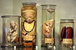 French doctor Louis Auzoux (1797–1870) pioneered the use of papier-mâché for highly detailed and colored anatomical models, with detachable parts, which allowed mass production for educational purposes. A selection of the many models on display: many human body parts, for example a box set with a model of female sexual organs plus almost 20 embryonic stages, models of the womb for every month of pregnancy. For purposes of comparative anatomy: models of brain or nervous system of diverse animals, models of blood circulation in diverse animals (e.g. a turtle, a crocodile), models of stomach or alimentary canal (e.g. octopus, honey bee).