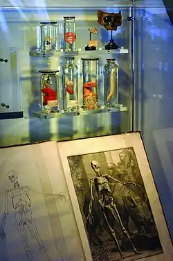 Sebald Justinus Brugmans was a Dutch botanist, physician and professor of natural sciences. As an army physician he became notable for his battle against unsanitary conditions, and spread of contagious diseases. The room shows a large collection of fish skins ('the protected body'), human skulls (some affected by accident or disease), animal skulls (mainly birds) and a variety of other anatomic samples, including some foetuses in a jar.