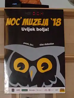 Museum Night (Croatian: Noć muzeja) is an annual event in Croatia. During one night in the year (usually on the last Friday in January), the entrance fee to most of the museums in Croatia is waived. Museum Night was first held in December 2005, with only six museums from Zagreb area participating, drawing 10,000 visitors. The event evolved to include museums in the rest of Croatia in the following years, with over 200 museums participating. In 2014, there were 360,000 museum-goers during the Museum Night, with 800 performances held.[1]