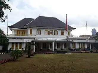 The building was built in 1920 following the design of J.F.L. Blankenberg.[1] It is a two-floored, 1,138 m2 Art-Deco-style building over a 3,914 m2 plot of land.[2][3] In 1931, the building was bought by insurance company Nillmij.[3] At the time the Pacific War broke out, the building was being as the British General Consulate. During the Japanese occupation of the Dutch East Indies, the building became the residence of Rear Admiral Tadashi Maeda until the arrival of the Allies in Indonesia in September 1945, when the building was used by the British as the military HQ.[3] The building was rented by the English Embassy from 1961 until 1981 when the building was given to the Indonesian Department of Education and Culture on December 28, 1981. In 1982, the building used by the National Library of Indonesia as an office building.[3]