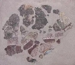 The detached murals are applied to transportable media so that they can be displayed in museums. Before they are examined microscopically and technically. This analyzes the composition of the material on which the painting was applied. Fractions of a painting are put together by the restorer in the best possible way and stuck with the painted side on a fabric, which in turn lies on a flat surface. A frame of appropriate size is made and placed around the fragments, then the frame is filled with fiberglass. The fragments are enclosed from the fiberglass. After drying, the fabric is peeled off and the adhesive removed from the resulting work.