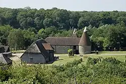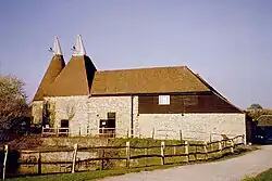 One of the original farm buildings. The oast originally had four kilns, two round and two square. Hops had last been dried here some time before 1925. The two square kilns were demolished in 1935 and the stowage was damaged in a fire in 1951. The oast was restored in 1984, both round kilns and one square kiln being restored with cowls. The oast houses a reconstruction of a village store, being the interior fittings of a general store in Hawkhurst.[3][15]