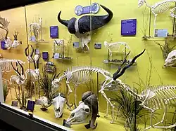 The museum offers many exhibits from all five vertebrate classes. There are also floating exhibits throughout the museum and whales hanging from the ceiling.[17] All the specimens on display are cleaned at the Skulls Unlimited building next door, using dermestid beetles[18] before being articulated and then put on display.[19] The exhibits display a wide range of topics, including locomotion, adaptation, and forensic osteology and pathology.[9][20] The museum also offers scavenger hunts and activities aimed at children and parents.[9]