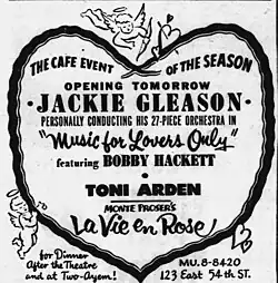 The success of Music for Lovers Only resulted in Gleason's public debut as bandleader on February 12, 1953, at the La Vie en Rose nightclub in New York City, wherein he performed the music from the album in a program shared with Toni Arden. Gleason said he did it as a favor to his friend Monte Proser, the club's proprietor.[43][44] "Monte has this club that needs unusual attractions because he's keeping it out of the usual entertainment rut and he said he thought my band could do some business for him", Gleason said. "Monte's done some things for me in the past. I couldn't turn him down".[13] He later recalled that he found the experience of conducting an orchestra in person "tough" and, because of his inability to read music, was required to memorize 28 different arrangements.[20] Among those who attended Gleason's debut were Steve Allen, Milton Berle, Johnnie Ray, and Jackie Coogan.[45]