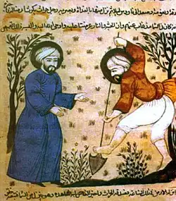 Medieval Islamic agronomists including Ibn Bassal and Ibn al-'Awwam described agricultural and horticultural techniques including how to propagate the olive and the date palm, crop rotation of flax with wheat or barley, and companion planting of grape and olive.[9] These books demonstrate the importance of agriculture both as a traditional practice and as a scholarly science.[9] In al-Andalus, there is evidence that the almanacs and manuals of agronomy helped to catalyse change, causing scholars to seek out new kinds of vegetable and fruit, and to carry out experiments in botany; in turn, these helped to improve actual practice in the region's agriculture.[12] During the 11th century Abbadid dynasty in Seville, the sultan took a personal interest in fruit production, discovering from a peasant the method he had used to grow some exceptionally large melons—pinching off all but ten of the buds, and using wooden props to hold the stems off the ground.[12]