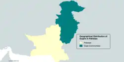 They are found across all divisions of Punjab and primarily in the districts of Faisalabad, Rawalpindi, Taxila, Jhelum, Gujar Khan, Sialkot, Lahore, Sheikhupura, Okara, Layyah,[24] Narowal, Muzaffargarh, Multan, Bahawalpure, Bahawalnagar, Gujrat, Gujranwala,[24] Rahim Yar Khan,[24] Jhang, Dera Ghazi Khan, Mianwali, Khushab, Sargodha, Sahiwal, Toba Tek Singh.[24] In northern Punjab, their population is estimated at 2.3 million, with additional populations found in central, eastern and southern Punjab.[25]