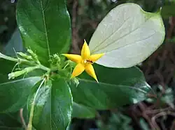 Mussaenda parviflora is a species of flowering plant in the family Rubiaceae, native to Yakushima and the Ryukyu Islands of Japan, Taiwan, and Guangdong, China.[1] A climbing shrub, it flowers March to May and fruits from August all the way to January.[2]
