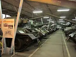 • Three T-34/85s - one inside the museum, in running condition, one formerly outside as gate guardian (currently removed for restoration and replaced with a PT-91), and one wartime production tank that was excavated from Biedrusko firing range (restored and rebuilt as a virtual reality tank simulator)