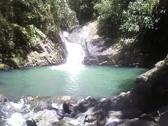 The Muzo people were considered the first inhabitants of Boyacá, originally from Saboyá.[5][6] Their territory stretched from the thick forests surrounding the Carare River in the north at the border with Santander, the Río Negro in the south, in the east the Pacho River and the Ubaté-Chiquinquirá Valley, and the Magdalena River in the west.[5] Other sources limit the Muzo area with the Sogamoso, Suárez, Magdalena and Ermitaño rivers.[7]