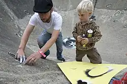 Although artistic since school, My Dog Sighs pursued a teaching career as a "proper", stable job.[6] In the early 2000s, My Dog Sighs was inspired by the emerging street art scene, including Banksy,[2] to attempt his own work.[7] He began by creating small pieces of art that he would leave in public, sometimes on his commute to his primary school teaching job, to be found by strangers.[2] Clues to the location of artworks are sometimes left on social media to combine treasure hunting with art.[8] My Dog Sighs said he weekly participated in Free Art Fridays "religiously" for 12 years.[6] The gifted art movement was reinvigorated by My Dog Sighs coining the term "Free Art Fridays"[9] and has since become a global phenomenon.[2]