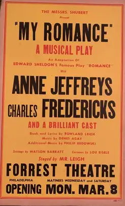 This show originally started out with music by Denes Agay and lyrics by Rowland Leigh. After try-outs in Boston, in Philadelphia at the Forrest Theatre,[1] and elsewhere, the show folded. It was revived with a new score by the famous Sigmund Romberg, and with Lawrence Brooks replacing Charles Fredericks. My Romance premiered on Broadway at the Shubert Theatre on October 19, 1948, and then transferred to the Adelphi Theatre, closing on January 8, 1949, for a total run of 95 performances.[2]