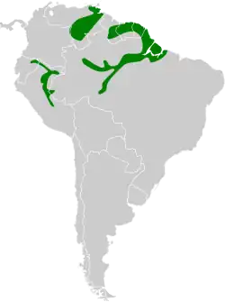 The yellow-crowned elaenia has a disjunct distribution. One population is found in the northeastern Venezuelan states of Monagas and Delta Amacuro. Another is found in the southern Venezuelan state of Amazonas and very slightly into Guainía Department in extreme eastern Colombia. A third is found in Sucumbíos and northern Orellana provinces of northeastern Ecuador, the northeastern quadrant of Peru, and slightly into far western Brazil. The fourth population has the largest range. It is found across the Guianas north of the Guianan Shield into northeastern Brazil and along the Amazon and its tributary the Madeira River from Amazonas state and Rondônia east to the Atlantic. The species primarily inhabits várzea and swampy flooded forest along large watercoureses. In Venezuela and the Guianas it also inhabits flooded forest growing on sandy soils. In elevation it reaches from sea level up to about 300 m (1,000 ft).[7][8][9][10][11]