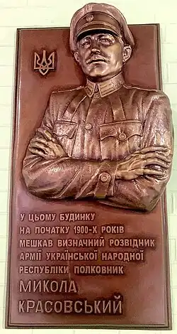 After Ukraine attained independence, Krasovskyi's life was memorialized in a number of articles, in the media and in expositions dedicated to the history of Ukraine's security services. In 2022 a memorial plaque was installed on the wall of a house in Kyiv where he lived in the early 1900s.[4][2]