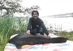 The black carp (Mylopharyngodon piceus) or Chinese black roach is a species of freshwater ray-finned fish belonging to the family Xenocyprididae, the East Asian minnows or sharpbellies.[2] The black carp is the sole extant species of the genus Mylopharyngodon. It is native to lakes and rivers in East Asia, ranging from the Amur Basin across China to Vietnam.[4] One of the largest cyprinids in the world, the black carp has a typical length of 60–120 cm (23.5–47 in), though it can reach up to 1.9 m (6 ft 3 in) in length and 35 kg (77 lb) in weight.[4] It is carnivorous and generally feeds on invertebrates such as snails, clams and mussels.