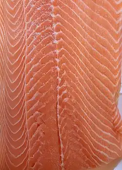 The fillet is made up of segmentally arranged structures called myotomes or myomeres, the shape of which varies along the length of the body. In three dimensions, the myomeres constitute a series of overlapping cones that are bounded by connective tissue sheets or myocommata called myosepta. Typically, a transverse steak through the fillet will cut through several myotomes at different levels. Each myotome contains a lateral superficial strip of dark muscle primarily composed of slow contracting fibre types that are used for sustained swimming activity (Johnston et al., 1977).