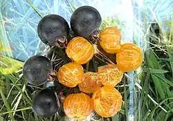 It presents small, globose fruits, 1 cm in diameter, dark purple when they reach maturity, with sweet and edible pulp and a large seed. It blooms from September to October and bears from November to January. It is found in the Paraguayan departments of Guaira and Caaguazú and in the Cordillera department.