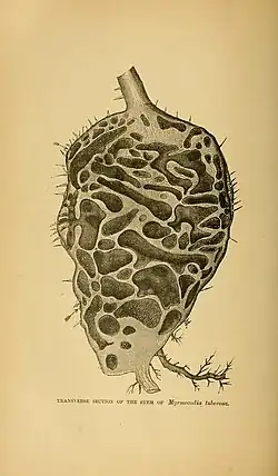 Myrmecodia species from the family Rubiaceae have the most highly specialized inner chambers, divided into smooth-walled chambers, which are used by ants for nurseries, and rough-walled chambers, used for waste disposal, insect prey remains, and bodies of dead ants from the colony.[4] The caverns with smooth walls have no observable nutrition uptake ability through their walls. Rough-walled chambers, on the other hand, are able to absorb nutrients. In an experiment done with india ink and water, the mixture was placed in both smooth and rough-walled chambers. The mixture was absorbed readily through the protrusions in the rough-walled chamber, but even after sitting on the smooth-walled chamber surface for 20 hours, no absorption was observed. The protrusions that make the walls rough are inward facing modified root structures that make nutritional uptake through the plant's rough-walled chambers possible.[5]
