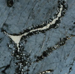Here Ca-bearing fluids enter primary alkali feldspar through cracks and react with the alkali feldspar. Through this reaction cracks are filled with quartz and myrmekite. The replacement reactions can affect large portions (> 60%) of the primary alkali feldspar. An important distinctive feature of this type of myrmekite formation is the constant thickness of the vermicules, whereas in the K-metasomatism their thickness changes as a function of the Ca-content of the plagioclase and they also taper towards the alkali feldspar.