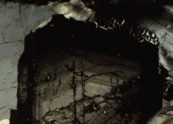When tectonic strains increase and the cataclasis becomes more intense interior breakage in the crystals ensues and albite-twinned plagioclase crystals are bent. The K-metasomatism therefore can reach deeper into the crystals and increase its effects. Nearly complete to complete replacement of plagioclase takes place and leads to the formation of wartlike myrmekite in places where the replacement was incomplete. The illustration shows tartan-twinned microcline having completely replaced plagioclase. The places with incomplete replacement are taken up by wartlike myrmekite.