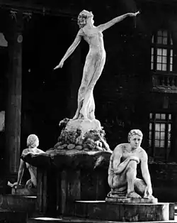 In 1921, Loy posed for Venice High School sculpture teacher Harry Fielding Winebrenner as "Inspiration"; the full length figure was central in his allegorical sculpture group Fountain of Education.[27] Completed in 1922, the sculpture group was installed in front of the campus outdoor pool in May 1923 where it stood for decades.[28] Loy's slender figure with her uplifted face and one arm extending skyward presented a "vision of purity, grace, youthful vigor, and aspiration" that was singled out in a Los Angeles Times story that included a photo of the "Inspiration" figure along with the model's name—the first time her name appeared in a newspaper.[29][30] A few months later, Loy's "Inspiration" figure was temporarily removed from the sculpture group and transported aboard the battleship Nevada for a Memorial Day pageant in which "Miss Myrna Williams" participated.[29] Fountain of Education can be seen in the opening scenes of the 1978 film Grease. After decades of exposure to the elements and vandalism, the original concrete statue was removed from display in 2002, and replaced in 2010 by a bronze duplicate paid for through an alumni-led fundraising campaign.[31][29]