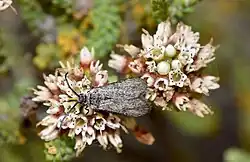 The length of the forewings is 9–10.5 millimetres (0.35–0.41 in) for males and 7.5–8.5 millimetres (0.30–0.33 in) for females. The forewings are blackish brown with scattered whitish scales. The hindwings are elliptical, dark grey-brown, but paler proximally.[1]