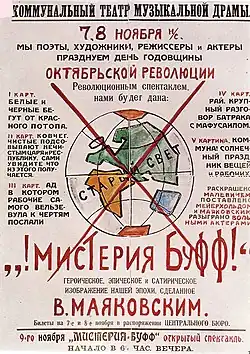 Mystery-Bouffe (Russian: Мистерия-Буфф; Misteriya-Buff) is a socialist dramatic play written by Vladimir Mayakovsky in 1918/1921. Mayakovsky stated in a preface to the 1921 edition that "in the future, all persons performing, presenting, reading or publishing Mystery-Bouffe should change the content, making it contemporary, immediate, up-to-the-minute."[1]