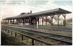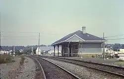 The New Haven, New London and Stonington Railroad opened from Stonington to Groton in December 1858 and was shortly thereafter acquired by the New York, Providence and Boston Railroad.[2] A wooden depot, similar to those still extant at West Mystic and Noank, was constructed.[3] The station burned on July 4, 1866, due to Independence Day celebrations; it was soon replaced.[4]