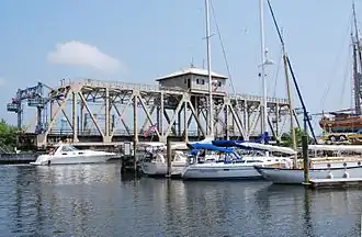 There have been three bridges at this location. The first bridge was a single-tracked, wooden drawbridge in 1819, which was replaced with a steel swing bridge in 1875.[1]