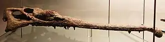 Mystriosuchus planirostris measured about 4 m (13 ft), according to a complete skeleton which was found in 1995.[4] The postcranial anatomy of the skeleton suggests that Mystriosuchus was more adapted to aquatic life than other known phytosaurs, possessing shorter and more paddle-like limbs as well as just two type of osteoderms as opposed to the higher diversity of other phytosaurs.[4] Cranial morphology is suggestive of a primarily fish eating diet, having long jaws like those of the modern gharials.[2] Several specimens have been recovered from marine fossil sites.[4][5] A study on phytosaur microwear shows a preference towards softer invertebrates.[6]