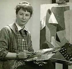 Nína Tryggvadóttir was born on March 16, 1913, in Seyðisfjörður. In 1920 the family moved to Reykjavík.[1] She studied art from Ásgrímur Jónsson, a close relative on her father’s side.[2] From 1933 to 1935 she also attended classes of Finnur Jonsson and Johann Briem.[2] She moved to Copenhagen in 1935 where she studied art at the Royal Academy of Art. After graduating from the Academy in 1939 she spent time studying in Paris and was quite taken by the city.