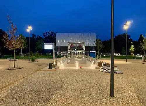 The main staircase faces Nørrebros Runddel. The escalator shaft is clad with yellow, ceramic panels, a reference to the yellow wall that surrounds the cemetery.